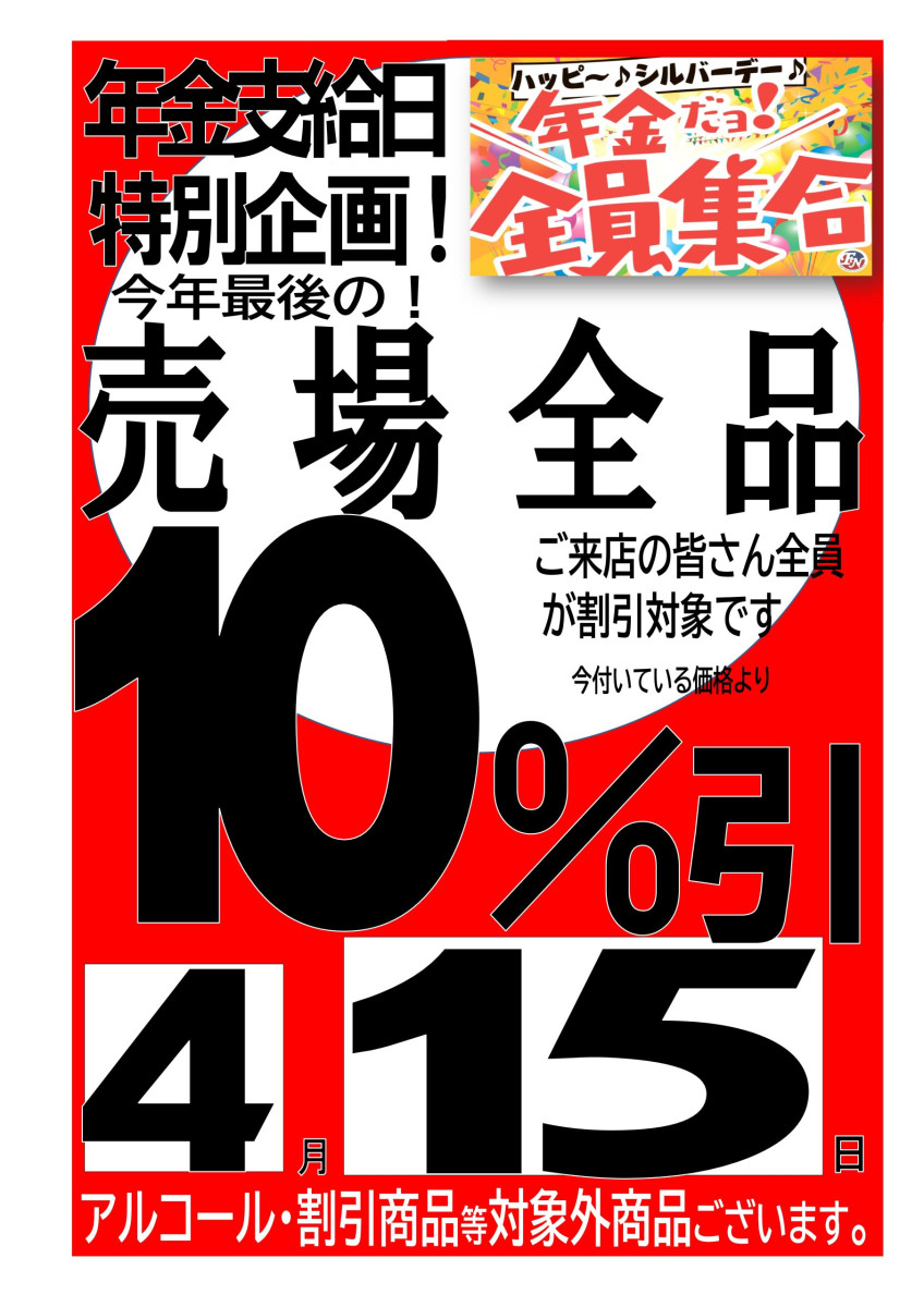 4月15日(水)はハッピーシルバーデーとして全商品10%引き(一部商品を除く)を実施いたします!!!