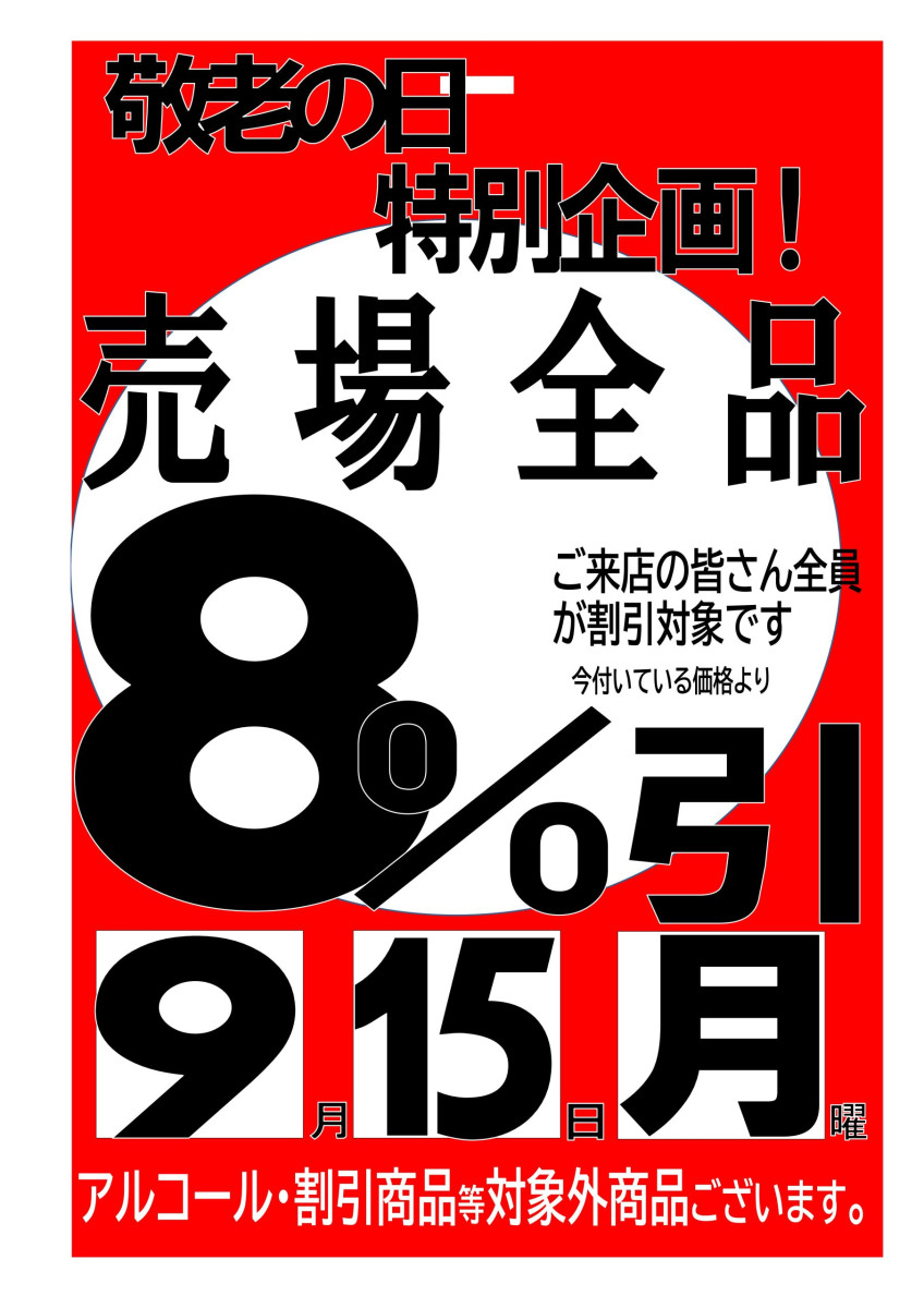 新聞休刊日セール! 2025/09/14 チラシでもお知らせしましたが、新聞休刊日のため売場全品8%引きセールです!!どんどんお買い求めください! アルコール・たばこ・割引商品等、一部商品は対象外となっております。ご注意くださいませ!!